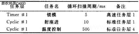 B&R 的PCC 控制器采用分时多任务操作系统,具备大型计算机的分析能力。从注塑机控制要求出发,将锁模、温控等过程对实时要求不同的任务设置在循环时间不同的任务等级中(如表1)。