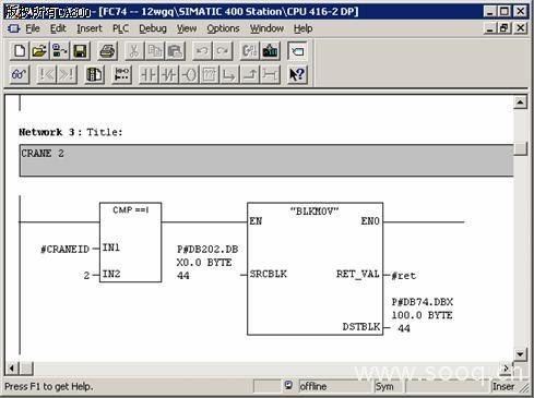 l编写“岸桥编号识别”程序:创建一功能FC74用于处理不同岸桥编号识别,然后将对应岸桥的数据块DB20X数据传输给一共用数据块DB74。如下图3-4所示:当岸桥编号CRANEID是2的时候,将岸桥2的数据块DB202的44个字节传输到共用数据块DB74中。