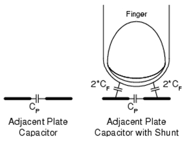 电容传感器通常由覆盖在PCB板上的铜片与地之间组成的电容构成。铜片上覆盖一层绝缘物质。当导体靠近电容器时,如图3,铜片和地之间的电容值就会随之而改变。电容感应弛豫振荡器对不一样的电容产生不一样频率的方波。脉宽调制模块和计数器对输出的频率计算。通过检测计数器的数值和与设定阈值进行比较,可以间断电容感应开关的开合。
