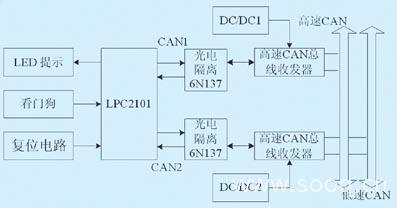 lpc2101微控制器分别通过光电耦合电路和高速can总线收发器tja1050于两路can总线相连。两路 can的连接方式基本相同,can总线驱动器都采用带隔离的dc/dc模块单独供电。这样不仅实现了两路can接口之间的电气隔离,也实现了网关与can 总线的隔离。