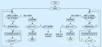 can/can网关的主要功能是实现两路can网段之间的数据过滤及转发,由于城市客车信息集成控制系统中对通讯实时性的要求,在进行软件设计时要做到数据存储和转发的时间尽可能短。为了达到这一要求,数据的接收采用irq方式,而且由于动力总成控制子系统的数据通信量明显高于车身控制子系统,因此将连接动力控制总成子系统的can1接受优先级设置最高,而连接车身控制子系统can2优先级次之,同时尽量精简中断服务程序,使系统的响应时间尽量的短。