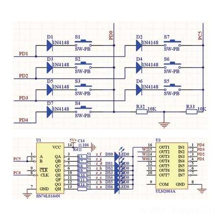 如图4所示,由于单片机I/O口有限,键盘和显示电路采用了端口复用,3位8段LED数码管驱动增加了SN74164串入并出芯片进一步缓解端口有限的压力。其中键盘有7个按键,分别为开关机、制冷/通风、强制冷、设定、上增、下减,可以进行温度设置和新风时间设置等。LED数码管可以显示当前车内温度、系统预设温度、输入电压等,当蜂鸣器报警时能显示故障代码为维修调试提供了方便。