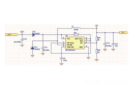 系统供电电路如图2所示,DC/DC转换芯片采用MC34063,该芯片具有集成基准电压、振荡器同步和输入电压范围宽等特点,其输出电压可表示为Vout=1.25(1+R39/R40),输出电流可达500mA,完全满足本系统的功耗要求。为了降低干扰,芯片的输入端和输出端加了电容C10、C12、C13进行滤波处理。