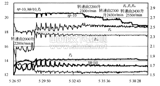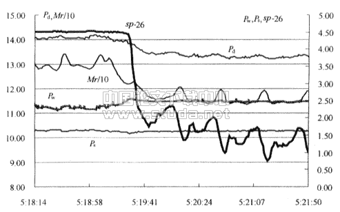 图5表示了压缩机转速在2000r/min时,蒸发器风扇从高档调到低档的特性变化。开始,Pd、Ps渐降,Pw渐升,Mr下降;当活塞行程变化时,Pd下降的梯度加大,Ps略上升,Pw停止上升,活塞行程、制冷剂循环量,Pd、Ps、P逐步稳定在适应车室环境的新稳态值上。