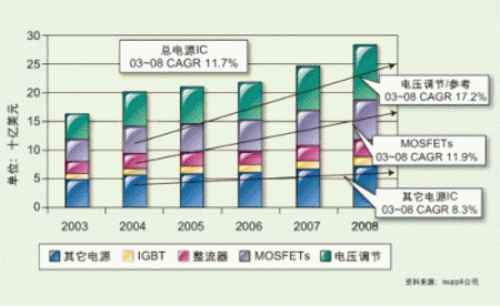 吉利发动机的林辉部长说:“汽油机缸内直喷控制系统正是采用了先进的IGBT模块,才极大地提高了燃油效率。”目前,博世的多点顺序汽油喷射智能点火控制模块已经广泛用于中国生产的汽车之中。随着汽油发动机由传统的电控多点燃油喷射向多点顺序喷射的转移,用于汽车点火控制的IGBT器件市场有望高速增长。isuppli预测汽车IGBT市场有望以17.2%的年复合增长率高速发展(图1),位居汽车电源管理器件之首,MOSFET市场增长据其次。