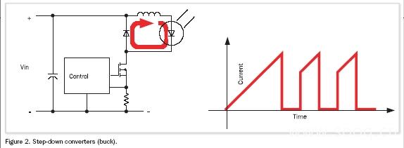 在降压恒流器应用中,流过LED的电流是连续的,但却是交迭的。而整个电路的能耗却是不连续的(图2)。它可在电源输入侧引发问题并通过电源线轻易地引发噪声。