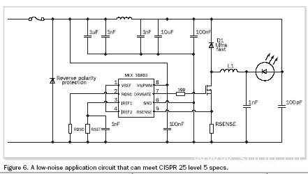 当在图6中使用该电路时,对典型的0.5~1A的LED电流来说,选L1和L2为100μH是个好主意。因噪声的谱域很宽,所以,电容器应能同时处理高频和低频。这就是为什么我们在线圈L2滤波器的两端都放置两组电容的原因。反馈二极管D1是高频噪声的主要来源。应仔细选择该二极管,并在应用中反复测试。对输入电压低于100V来说,肖特基二极管是最好的选择。
