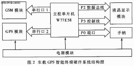 主控单片机采用具有两个串口的高性能单片机W77E58。在系统中,主控单片机负责接收用户的手柄输入信号和GPS输入信号;对GPS信号进行计算,以获得当前的经、纬度坐标;接收并解析ITS中心发送的短消息命令,按命令进行上传定位坐标、报警等操作;另外还负责把系统的运行状态及ITS的信息通过液晶屏显示出来。