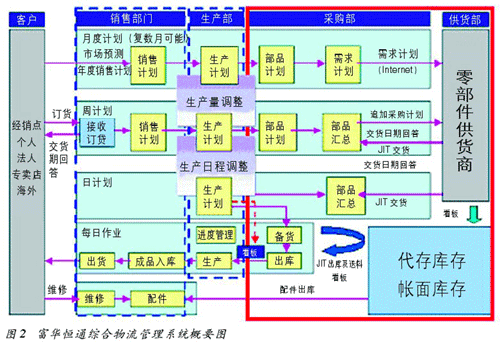 企业根据经验,在富华恒通综合物流管理系统内设置供应商的安全库存量。由于富华恒通综合物流管理系统提供与HHT(Hand-Hel d Terminal)等硬件设备的接口,企业可以利用硬件设备统计出进货、出库、退货等物品信息,计算出实际库存的数量,并通过对生产计划进行分析,预测企业对零部件的需求情况。根据以上数据,富华恒通综合物流管理系统自动计算出供应商应提供的零部件数量。供应商通过系统为其设置的专用帐户,登陆富华恒通综合物流管理系统就可以查询企业的采购需求计划、供货商提供产品的当前库存量、安全库存量以及供应商应提供的零部件数量等信息。同时,系统还允许供应商登录发布发货信息,通知仓库管理人员提前做好准备。富华恒通综合物流管理系统根据生产日计划自动生成零部件上线发料单,然后利用看板将零部件信息传送进企业生产现场,按实际上线的数据与供货商进行结算。
