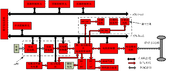 我公司组织研发的“混合动力电动城市客车”采用的是中央驱动典型的串联式混合动力系统。串联式动力由发动机、发电机和电动机三部分动力总成组成,它们之间用串联的方式组成SHEV的动力单元系统。负荷小时由电池驱动电动机带动车轮转动,负荷大时则由发动机带动发电机发电驱动电动机。当电动车处如启动、加速、爬坡的工况时,发动机-电动机组和电池组共同向电动机提供电能;当电动车处低速、滑行、怠速的工况时,则由电池组驱动电动机,由发动机-发电机组向电池组充电。