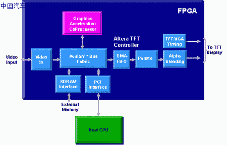图1 采用FPGA和主机处理器的汽车图形控制系统