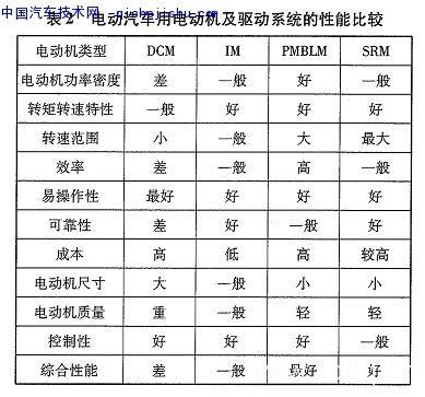 目前,电动汽车用电动机主要有直流电动机(DCM)、感应电动机(IM)、永磁无刷电动机(PM-BLM)和开关磁阻电动机(SRM)4类,其性能对比见表2。