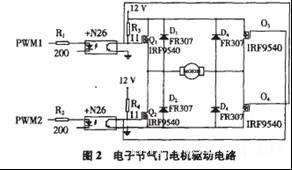 要控制节气门的开度,就需要控制其直流电机的输出扭矩,该扭矩与电机线圈中的电流成正比。如图2所示,直流电机PWM功率驱动电路:DSP产生PWM信号通过光电耦合器控制功率MOS管来完成对直流电机电源的高频开闭,最终控制节气门的开度。由于节气门片需要正反两个方向转动,所以需要搭建一个H桥电路来满足对直流电机双向控制的需求。光电耦合器实现上、下级之间的电器隔离,防止有高电压大电流进入主控电路,干扰DSP的正常工作。4个二极管具有消除电压尖峰的作用。