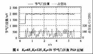 节气门开度控制实验中,节气门位置传感器的电压为反馈量,PWM的占空比信号为控制输出量。实验中由PC机监控系统向DSP发送目标开度值和PID控制参数,DSP根据控制参数和节气门位置信号计算并输出PWM信号,电机执行命令,控制电子节气门完成动作;同时DSP向PC机监控系统传送控制过程,PC机记录并显示实际控制效果,根据控制效果不断调整PID控制参数,最终达到最佳控制。图4记载了试验中进行的阶跃响应测试,参数KP=65,KI=125, KD="10",电子节气门从初始值1200mV到目标值2000mV的阶跃变化情况。从系统的阶跃响应曲线可知节气门上升时间短且稳态跟踪误差小,满足系统响应和控制精度要求。