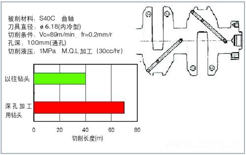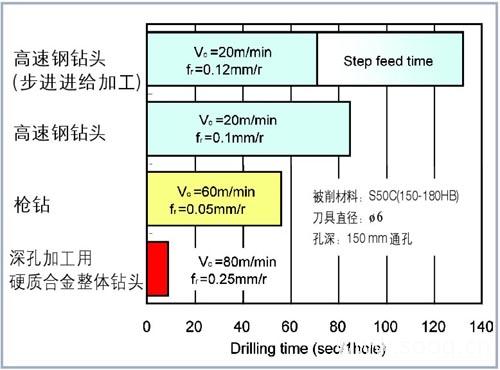 图2所示的是最新深孔加工用硬质合金整体钻头与以往的深孔加工用钻头切削时间的对比情况。采用直径为?6mm的内冷型钻头,加工Ld=150mm的深孔,分别采用各自推荐的常规切削条件进行加工。结果显示,整体硬质合金钻头的加工时间大约是以往加工方式的1/5(与枪钻相比)~1/10(与高速钢钻头相比),大幅提高了生产效率。