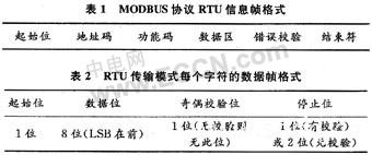 Modbus协议有两种模式:ASCII和RTU模式。一个Modbus通信系统中只能选择一种模式,不允许两种模式混合使用。本系统采用RTU模式,消息的起始位以至少3.5个字符传输时间的停顿开始(一般采用4个),在传输完最后一个字符后,有一个至少3.5个字符传输时间的停顿来标识结束。一个新的消息可在此停顿后开始。在接收期间,如果等待接收下一个字符的时间超过1.5个字符传输时间,则认为是下一个消息的开始。校验码采用CRC16方式,只对设备地址、功能代码和数据段进行。整个消息帧必须作为一连续的流传输,传输速率较ASCII模式高。