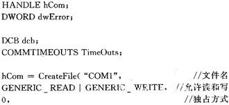 在VC中设计串行通信程序时要用到一些通信的API函数,如CreateFile(),CloseHandle(),ReadFile(),WriteFile(),SetupComm(),WaitCommEvent()等。除上述几个函数外,还要经常用到一个重要的记录DCB(设备控制块)。DCB中记录有可定义的串行口参数,设置串行口参数时必须先用GetCommState函数将系统默认值填入DCB控制块,然后才可把用户想改变的自定义值设定。