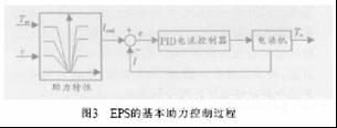 EPS的助力过程:控制器根据转向盘转矩传感器的输出Tsw和车速传感器的输出v,由助力特性确定电动机的目标电流Icmd,然后由电流控制器控制电动机的电流I,使电动机输出目标助力(矩)。因此,EPS的控制要解决两个问题:一是确定电动机的目标电流;二是跟踪目标电流。其基本助力控制过程如图3所示。电动机的目标电流是根据助力特性曲线确定的,在同一转向盘力矩输入下,电动机的目标电流随车速的增加而降低,电流愈小则助力愈小,这样能较好地兼顾轻便性与路感的要求。