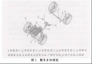 (2)除了轮胎、阻尼元件、弹性元件、橡胶元件以外,其余零件认为是刚体,在仿真分析过程中不考虑它们的变形;簧载质量看作一个具有六个自由度的刚体。