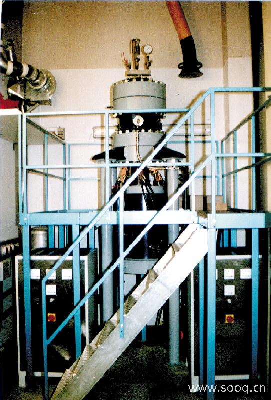 2) 真空设备包括变频器、真空计、真空泵、智能控制仪表、真空控制器和密封设备等,真空计采集炉腔内的真空度,真空控制器根据真空度变化调节变频器频率,进而改变真空泵的运行频率,以保证炉腔内的真空度稳定;加温设备包括中频加热炉、中频电源、电流/电压传感器、可控硅和PID智能调节温控仪表等,温控仪表采集电流传感器的模拟量信号(此值与炉内温度成线性关系),根据电流值和设定值进行PID调节,输出给可控硅来调节中频电源的电流,进而保证炉内温度的稳定;运动设备包括步进电机、G3 PLC、丝杠、编码器、限位开关和触摸屏等,闭环调节籽晶杆和坩埚杆的运动,调节坩埚自转,各种参数可以设置。生长炉外型结构见下图: