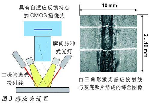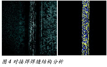 由两根等幅激光线按一定角度投射到待检测焊缝上来获取焊缝的三维数据,即焊缝几何形面数据。 同时在一个闪光装置持续20ms的闪光瞬间,CMOS摄像头拍摄待检测焊缝区的灰底照片(见图3)。为获取上述两种方式在图像上的最大对比度,摄像头既有自适应光学特点,也可通过专用软件设定,因此,系统最终获取的单一图像中可反映出待检测焊缝区的全部信息。系统获取的标准图像尺寸为10mm×10mm,分辨率为10mm。在实际生产过程中,感应头或待检测工件需在连续运动中取像,系统的取像触发装置可保证连续取像的两个相邻图像有一定重叠,从而实现无间断取像检测。受限于摄像头取像速度及数据传输速度,系统的检测速度为30m/min。由于系统取像与检测速度快,因此,在实际应用中,影响检测速度的瓶颈往往是其他生产装置,如焊接机器人、工件穿梭装置等。