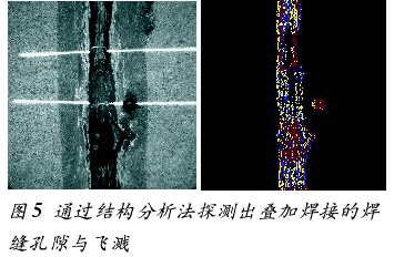 焊缝组织结构一般通过一个决定性的、随机的、非均质的纤维性结构来反映,即“鱼骨形” 结构(见图4)。为了对焊缝结构进行分析,系统根据纤维结构的斜度、方向及多像素方式生成焊缝结构特征。这些结构特征可以仅通过少量的数字来反映焊缝表面质量与平滑均匀性等特征。如果在每个焊缝区这些结构特征数据变化很大,则说明焊缝出现局部焊接缺陷,比如由于等离子保护造成的溶烧深入不足或者由于工件表面涂层造成的孔隙或焊坑(见图5)。细小的焊接缺陷(如针孔)通过这种方式无法探测,因此,该系统利用第3种分析算法来发现小于几百mm的细小焊接缺陷,如在激光钎焊焊缝上探测直径仅为200mm的针孔(见图6),这种方法称为针孔分析法。