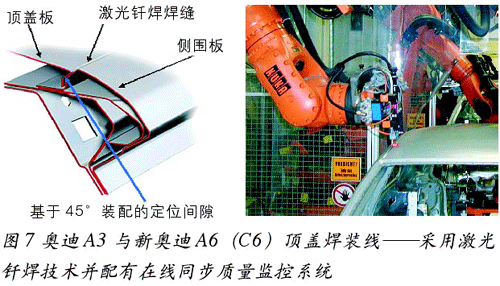 “SOUVIS? 5000”已经在欧洲几家汽车制造商的白车身焊装生产线上装配应用,用以检测轿车车顶激光钎焊焊缝质量及地板总成激光焊接焊缝质量。其中一个主要的应用实例为德国的奥迪汽车。1年多以前,奥迪就在其A3与新A6白车身焊装线上安装了该焊缝质量在线实时监控系统(见图7)。值得一提的是,奥迪不但采用该系统检测顶盖激光钎焊的焊缝质量,而且有选择地检测喷底漆后的焊缝质量,后者可进一步保证奥迪轿车的顶级制造质量。
