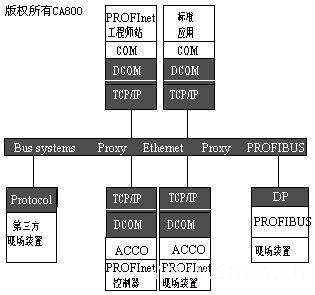Profibus可以通过代理服务器(Proxy)很容易地实现与其它现场总线系统的集成,在该方案中,通过代理服务器将通用的Profibus网络连接到工业以太网;通过以太网TCP/IP访问Profibus设备是由Proxy使用远方程序调用和Microsoft DCOM进行处理的。