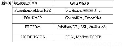 表中列出了当前工业以太网技术的4个主要竞争者,FF HSE、EtherNet/IP和PROFInet现场级都有自己的现场总线,这种格局今后不会改变。Phoenix Contacts公司Type8 INTERBUS采用的IDA工业以太网技术发展很快,并将工业以太网延伸到现场I/O级,同时Modbus TCP/IP协议已被提交国际因特网工程特别工作组(IETF),希望这个协议能成为工业因特网协议标准。为了使此项工作加速推进,MODBUS组织和IDA组织于2003年10月底宣布合并。国内也正在开展工业以太网的开发工作,浙大中控技术有限公司开发的EPA工业以太网已经延伸到现场一级,并在化工厂获得成功试用。