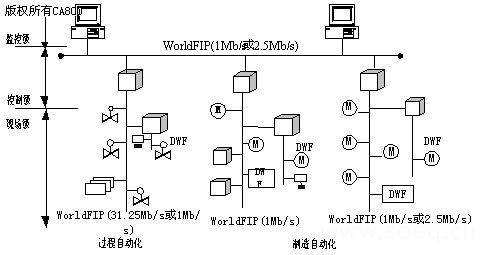 WorldFIP现场总线体系结构如图7所示,系统分为三级,即过程级、控制级和监控级。它能满足用户各种需要,适合于各种类型的应用结构,集中型、分散型和主站/从站型。用单一的WorldFIP总线满足过程控制、工厂制造加工和各种驱动系统的需要。为了适应低成本的要求,开发了低成本的Device WorldFIP(DWF)总线,它是设备一级网络,能很好适应工业现场的各种恶劣环境,并具有本质安全防爆性能,可以实现多主站与从主站的通信。