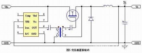 图5所示这种直接驱动方法的突出优点是成本最低,但由于变压器只能传递交流信号,因此输出的正负脉冲幅值随占空比而变,只适用于占空比在0.5左右、而且变化不大的情况。同时由于变压器的负载是MOS管的输入电容,驱动脉冲的前后沿一般不会很理想。