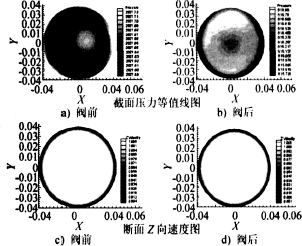 在数值计算得出结果后首先是定性分析。在计算结果的三维模型中取一轴向平面,利用工具软件显示其Z-velocity云图,90°全开的数值结果如图3显示,阀门上下速度呈对称状态,阀门内流速度分布合理。通过对阀门前后某管道截断面压力场进行三维数值离散积分,得出远离阀门一定距离的前后管道截断面的平均压力值,进而得出阀门压降,截面压力如图
