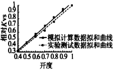 为了验证三维湍流数值模拟的数据结果,我们专门加工制造了与三维计算模型相同尺寸和相同内部结构的阀门模型,同时搭建了装配有高精度流量传感器和压差传感器的管路实验台(如图5所示)。利用高分辩率电动执行装置转动阀门,在不同的开度下测量阀门的压降以及流量Q。其中流量系数、相对流量系数的定义参考文献[1]、[2](见表1),试验对比结果如图6所示。