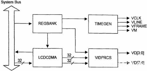 由于不同尺寸的LCD具有不同数量的垂直和水平象素、数据接口、数据宽度、接口时间和刷新率,S3C44BOX中的LCD控制器可以对相应的寄存器值进行编程,以适应不同的LCD显示板。