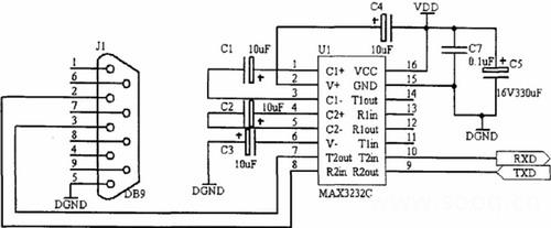 需要注意的是,MAX232是5V器件,而处理器芯片是用的是3V供电,因此需要考虑电平转换,否则将无法正常收发数据。由于Maxim公司已经注意到这点并推出了专用3V供电的器件MAX3232C,利用它就可以无需考率3V到5V的电平转换问题。MAX3232C与处理器的接口电路如图5所示。