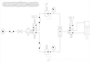 由于悬挂焊机气动控制系统只提供一种气源压力给焊枪,导致焊枪在焊接不同板材配合时只能提供一种压紧力进行焊接。在相同压力下,高强度钢板的配合面间隙大于普通低碳钢板,导致焊接部位产生飞溅,飞溅带走大量的热量和焊核金属,使形核难度增加,从而降低焊接强度。针对目前共线生产的4种车型中高档车大量采用大压力、低碳钢板,我们采用小压力提供给焊枪进行焊接,并对焊机气动控制系统进行改造(如图2)。