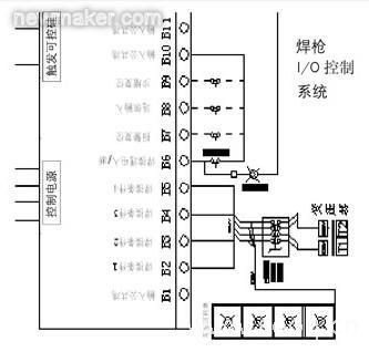 在焊机外扩展电路中,将灯塔上的车型灯信号采集入控制电路系统。该车型信号通过继电器的逻辑组合来完成所需要的功能。在改造中,由于控制系统的电源与车型监视器灯塔的电源类型不一致,不能将采集到的车型信号直接给外扩增加的I/O电路用以控制电磁阀,而是通过中间继电器的触点提供直流(DC24V)电源来控制电磁阀,并提供气源压力给焊枪进行焊接。当车型选择开关旋置雅阁或是奥德赛车型时,扩展电路将该信号采入新增的I/O逻辑电路中控制电磁阀(valve1)得电导通,气源将大压力提供给焊枪进行焊接。当车型选择开关旋置思迪或是飞度车型时,电磁阀(valve2)得电导通,气源将小压力提供给焊枪进行焊接。