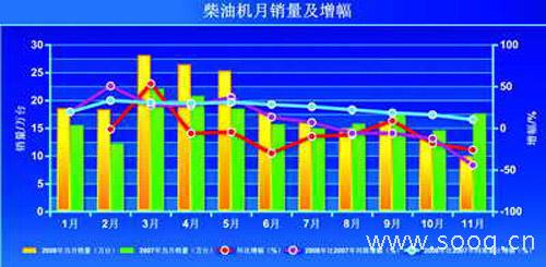 2008年1~11月,我国柴油机累计销售204.11万台,同比增长10.59%,占总量25.4%左右