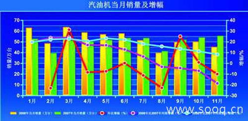 进入2008年下半年,市场出现疲软,全球金融危机对我国车市的影响逐渐凸显。7~11月,汽油机销量同比增幅与上半年相比大幅下滑,8月滑到谷底,仅销售39.5万台左右。其间,除7月仍保持6.4%的增长外,其余各月均为负增长,且下降速度较快。其中,11月同比下降约18.5%,销量为45万台左右,比除8月外的其余各月都低。