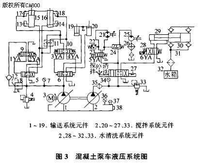 混凝土输送泵车由混凝土输送液压系统,搅拌液压系统,清洗液压系统,泵车支撑系统等组成。