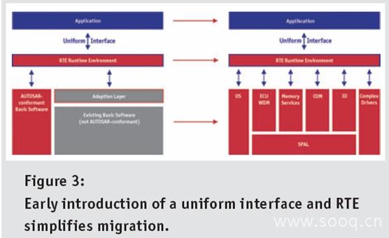 因此,在应用程序和基础软件之间引入一个分隔层是非常明智的选择。一个可行的方法是在移植过程的早期就准备好应用程序和AUTOSAR软件组件,并将它们通过RTE集成在一起。在RTE之下,一个专用的修改层用于为已有的基础软件提供接口,如图3所示。