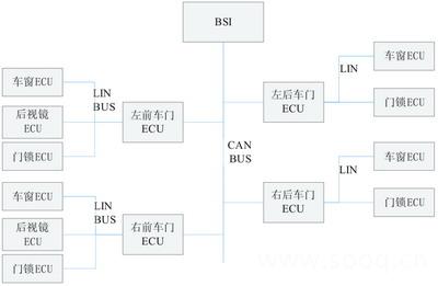 第二种方案是每个车门采用分布式LIN网结构,将各个功能做成单独的节点,即单独的后视镜控制节点,车窗控制节点,门锁控制节点,开关输入控制节点,该开关输入控制节点可以同时作为LIN的主节点,每个车门的主节点同时为CAN-LIN网关节点,BSI和四个车门通过CAN网连接。如图2所示。