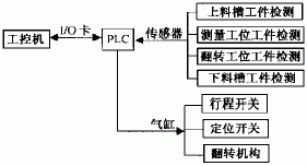 系统主要由机械部分、电气部分、控制部分组成。机械部分主要是完成零件的传送(从安装位置到检测位置,再送到下一个工序的加工位置)、定位(保证零件与摄像头的同心度)以及不合格零件的剔除;电气部分有传感器、汽缸等执行机构组成;控制部分采用PLC和工控机集成控制。系统硬件配置主要有工控机、可编程控制器、CCD摄像头、图像采集卡、I/O接口板、传感器等硬件及部分外围电路组成,它们的结构,如图2示。