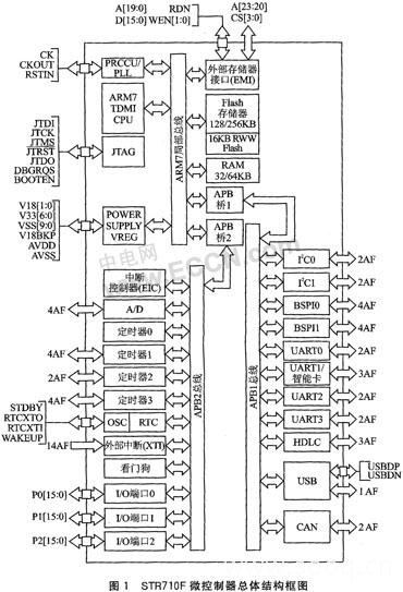 STR710F微控制器总体结构如图1所示,内部总线和2条APB总线将片上系统和外设资源紧密地连接起来。其中,内部总线是主系统总线,连接CPU、存储器和系统时钟等;APB1总线接高速外设,APB2总线连接系统通用外设和中断控制。I/O端口包括P0、P1、P2三个16位端口,其他的外设接口引脚都与I/O端口的引脚功能复用。此款处理器支持CAN总线功能,这在汽车电子中有着很重要的应用。