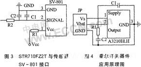 单个霍尔开关器件的应用原理图如图4所示.由于A3210ELH的功耗极低,最大工作电流小于3 mA,可以由微处理器的I/O口直接驱动。在输入端靠近芯片A3210ELH的位置处,应设置旁路电容C1为0.1μF,可以减小外部噪声和内部斩波对传感器信号的影响。输出旁路电容C2为输出的跳变信号提供能量,R1用于其间的保护。