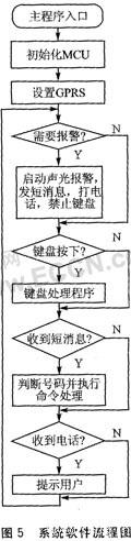 软件部分采用微控制器嵌入式C语言进行编写,如图5所示。软件流程图重点在于振动(防盗)检测部分和GPRS通信的编写。