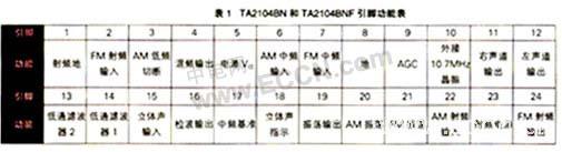 TA2104BN和TA2104BNF均采用了24引脚结构,它们不仅内部电路完全相同,而且相应的各个引脚的功能也是完全一样的,其各引脚功能见表1。两者的区别除了外形不同之外,最大耗散功率PD也是不一样的,TA2104BN为1.2W,TA2104BNF则只有0.5W。