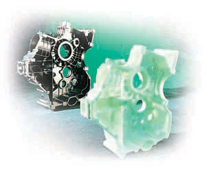 图2中的摩托车赛车变速箱的融模铸造金属件,由于具有复杂的几何形状和高要求的机械性能,因此,对于这些薄壁件的生产来说,熔模铸造过程是十分困难的,尤其是使用钛金属。而以聚苯乙烯粉末材料烧结的工件,可以得到不错的表面质量,并很容易用于融模铸造(灰粉残留率万分之五)。从这个例子来看,铸造并不仅限于原型的制造,也可用作最终产品零件的小批量生产。