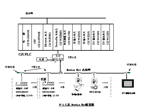本设计方案将整个控制系统分成两部分,T11前装配线和T11后装配线各自构成独立的控制系统。在网络结构上,整个系统分为两层。第一层为ETHERNET网,包括1台上位监控计算机、2台大屏幕显示器;第二层为2台OMRON PLC控制系统;第三层为DEVICENET控制网络。其中,上位计算机主机选用台湾研华工控机,其配置为PIIII 2.4G/256M/80G、17寸PHILIPS纯屏彩显、D-Link 10M/100M网卡、山特UPS。上位机安装Windows 2000 简体中文版(SP2),IFix 3.5简体中文版组态软件和微软SQL Server数据库。主控站为OMRON SYSMAC CJ1系列PLC,DEVICENET从站包括 IP67现场输入模块DRT2-HD16C、IP67现场输出模块DRT2-OD08C、DEVICENET智能从站DRT1-232C2、RFID系统(由数据载体DEVICENET单元V600-HAM42-DRT、数据载体读写头V600-HS63和数据载体V600-D8KR12组成)。整个控制系统配置图如下图所示,由于实际中DEVICENET从站很多,图1中只是列出了每种类型的从站。