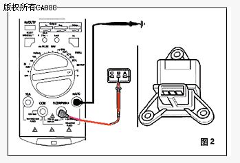 2.关闭点火开关,断开传感器的电子连接接头。黑色表笔插到仪器的“OUTPUT—”的插孔,另一端搭铁(使用鳄鱼夹),红色表笔插到“+OUTPUT”插孔,另一端与传感器的输入信号线连接(可以使用万用测试线),如图2所示。